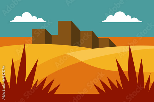 Stylized flat illustration of rolling desert sand dunes under a clear blue sky in a minimalist style