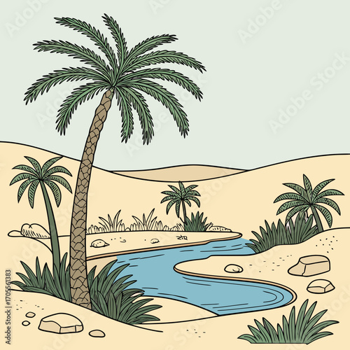 Stylized illustration of rolling sand dunes under a clear blue sky