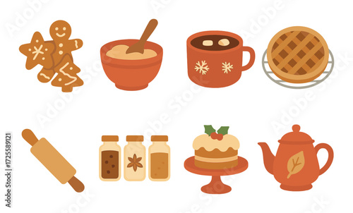 Winter Treats Cozy Bakery Style silhouette set: gingerbread cookie, hot cocoa mug, cinnamon roll, slice of pie, frosted cupcake, cookie tin, candy cane, muffin, caramel apple,