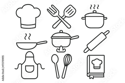 Cooking and Baking Tools Icon Set in Flat Kitchen Style with Rolling Pin Mitt and Mixing Bowl