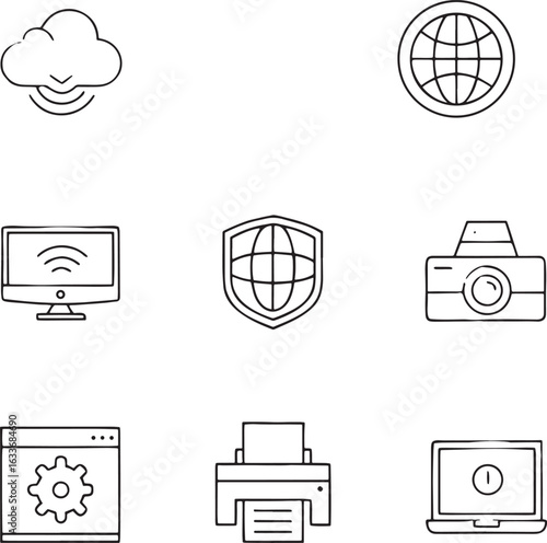 Video hosting set icon. Image sharing, video streaming, video player, 3D modeling, cloud service, playback, mobile app, playlist, digital note, voice assistant, puzzle, interface.
