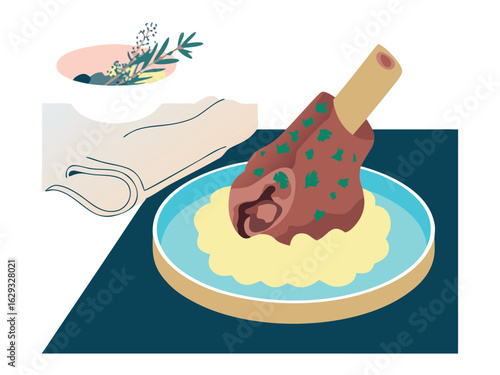 Hearty beef stew with mashed potatoes illustration on a plate, showcasing a classic comfort food meal and simple meal presentation for culinary and dining concepts
