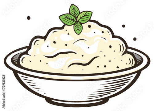 Mashed potatoes, creamy texture, food bowl, swirled surface, comfort food, homemade dish, white ceramic bowl, delicious side, culinary illustration, vector art