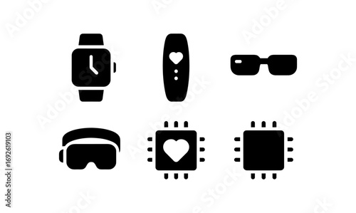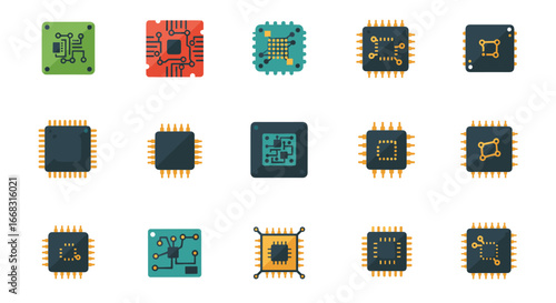 Microchip circuit icon collection, electronic processor symbols, computer chip design, technology motherboard element, semiconductor integrated system vector, digital innovation concept
