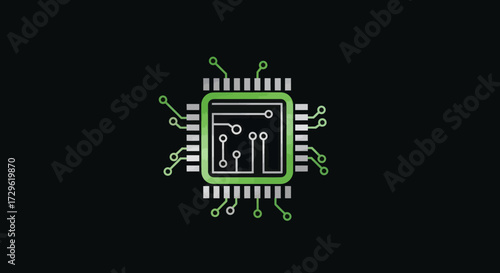Minimalist black and white microchip symbol with circuit lines and connectors.