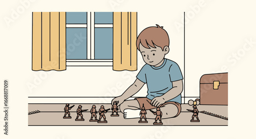 A Young Boy Playing with Toy Soldiers, Depicting Childhood and Imaginative Play
