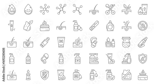 Hair and scalp treatment line icons. Hair care, coloring, washing, styling, hair loss, growth, and transplant. Editable stroke. Vector illustration.