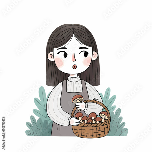 Cute cartoon girl holding a basket full of fresh mushrooms with greenery in the background