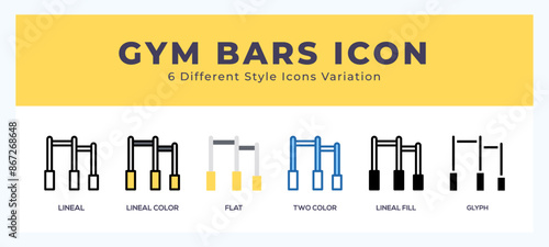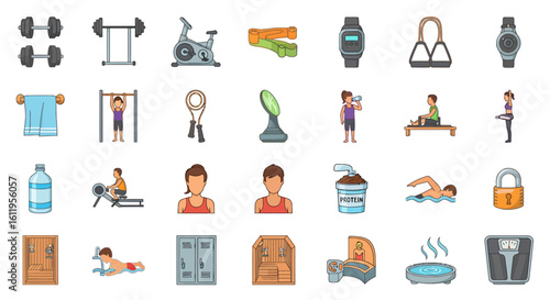 Vector Icons Set of Colorful cartoon icon set of gym equipment workout routines and wellness items. EPS Editable