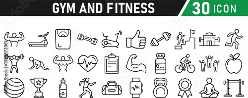Gym and fitness 30 icon set. Healthy lifestyle, weight training, body care, and workout or exercise equipment are icons. Icons vector collection.