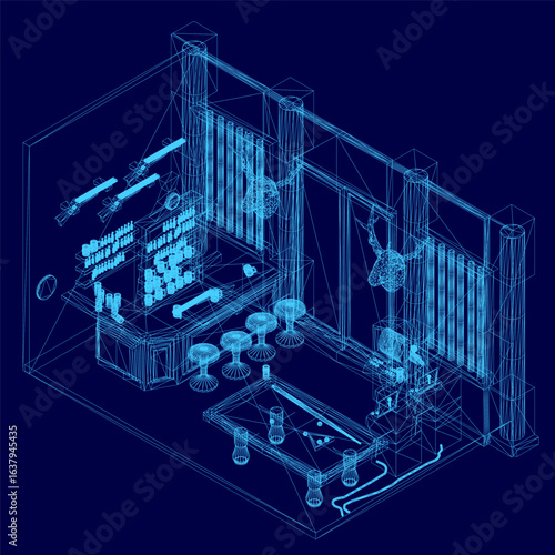 Sports Bar Icons. Outline icon set of sports bar interior: bar counter, high stool, flat-screen TV, neon sign, pool table,