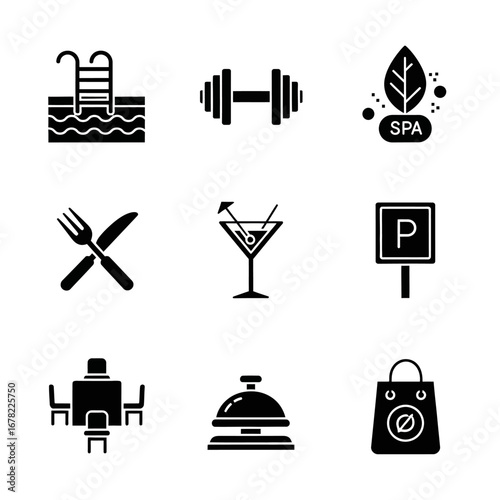 Hotel service icon set. Hotel room icons. black solid vector symbols for travel, accommodation, hospitality, amenities, food, fitness, swimming, parking, 24-hour service, and airport transfer