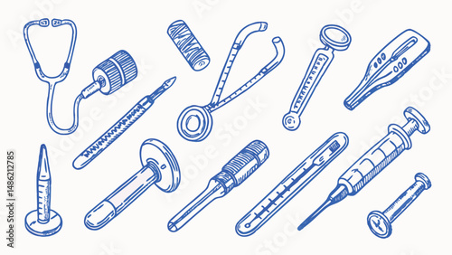 Syringe, tweezers, scalpel, enema isolated on white background. Vector illustration. Simple line-art icons, doodle style, medicine objects. Doctor tools, treatment, clinic, hospital, emergency, help.