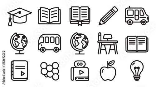 "Educational Icons – Graduation, Book, Pencil, Globe, and Classroom Symbols"
