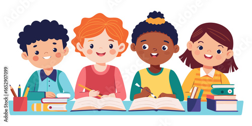 Children and Students Studying at Desks: Happy Young Learners Engaged in Homework and Education, Back to School Cartoon Illustration.