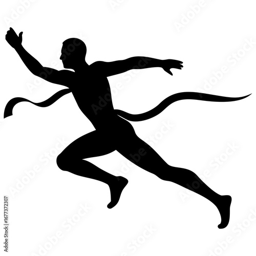 Runner silhouette. Sprinting athlete at the finish with a winning tape. Glyph black icon. Vector illustration flat design. Isolated on white background. Sport man. Speed race and winner.