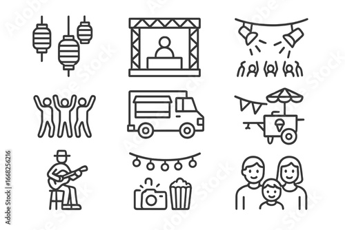 Festival Icon Collection. Outline icon set of festival city life: parade floats, fireworks, street musicians,
