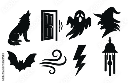 Halloween sound silhouette icons set – ghostly, spooky, haunting symbols for design