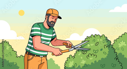 Illustration of a Gardener Trimming a Bush with Tools, Garden Work and Green Leaves