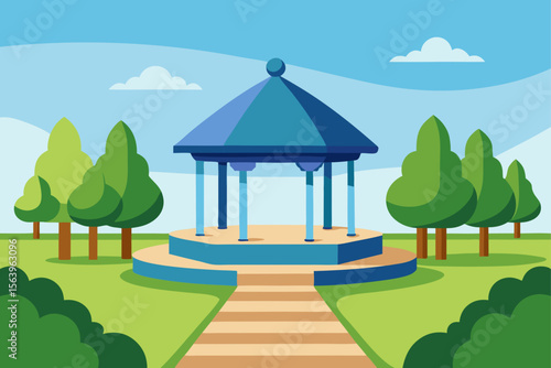 Whimsical cartoon backyard pathway with trimmed hedges and garden elements vector illustration