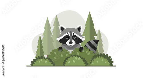 Cartoon Raccoon Peeking Out Of Bushes Among Trees In Forest Scene