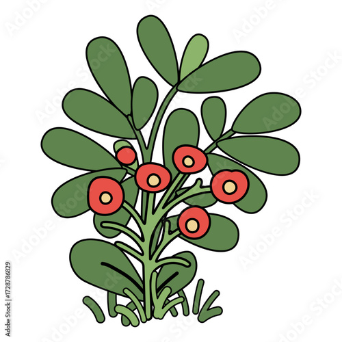 Simple drawing of a bush with green leaves and red berries. Hand drawn plant element for nature or springtime concept graphic design.
