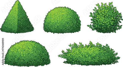 Green bush vector set with diverse shapes and foliage styles for landscaping, gardening, nature design, and outdoor decorative themes