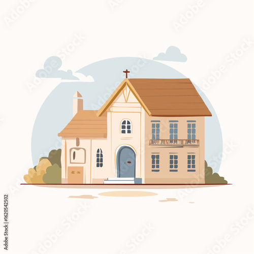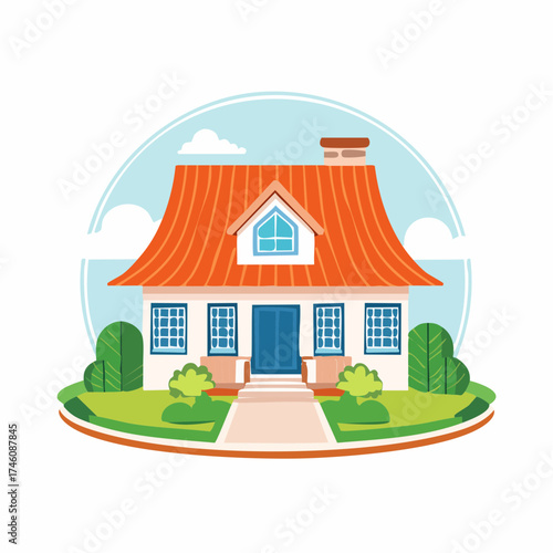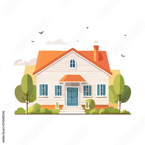 Illustration of a charming house with orange roof, blue door, and lush green trees in a flat design style.