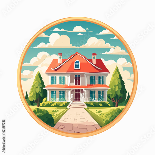 Charming suburban home with red roof and manicured landscape in a circular frame view