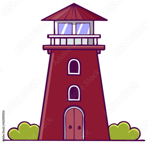 Cartoon Red Lighthouse with Green Bushes Illustration Nautical Beacon Isolated