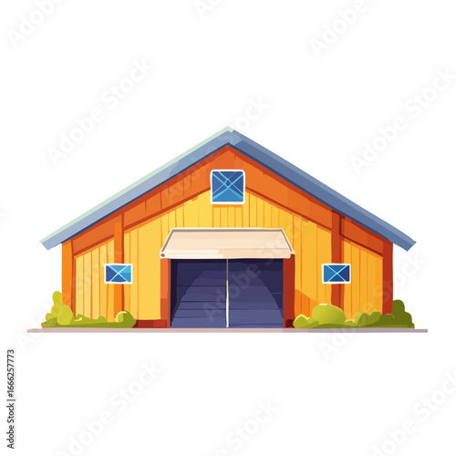 Cartoon Yellow Barn Building with Blue Trim, Garage, and Shrubs, Isolated