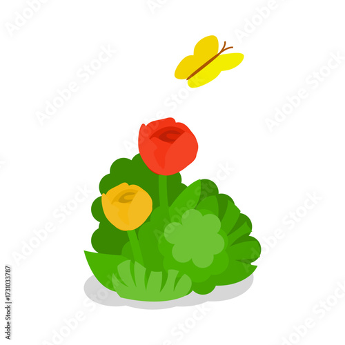 Charming yellow butterfly flies over vibrant red and yellow tulips blooming in a lush green bush on a white background