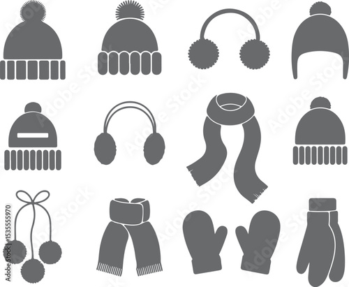 Winter clothing set, hats, scarves, mittens, coats, boots, socks, seasonal fashion, cold weather outfit, flat vector illustration, CAD drawing style
