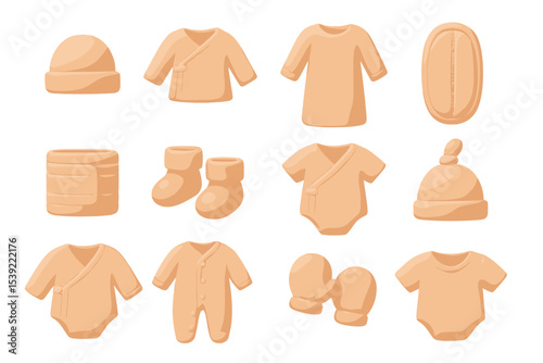 A charming, hand-drawn illustration depicts a baby onesie, hat, socks, mittens, and booties arranged in a row against a white background, perfect for design projects.