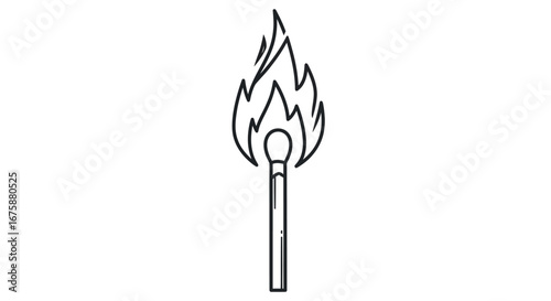 Lit Matchstick with Fiery Flame, Line Art Illustration.