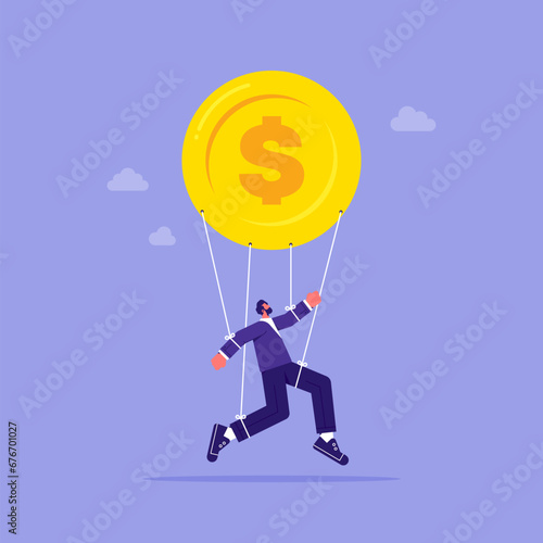 Being controlled by money, capitalism, greedy working environment, slavery, decision manipulation or bribery and corruption concept, pathetic slave businessman puppet doll being controlled by money.