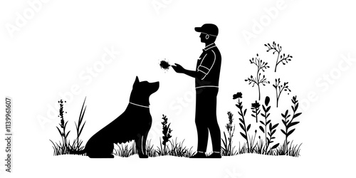 Trainer showing a dog how to roll over using verbal and hand signals, Vector Graphic