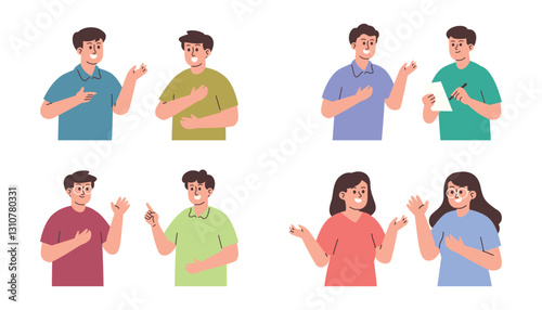 Set of flat people talking to each other with speech balloons characters. Cartoon tiny people on street isolated on white background. Flat vector Illustration. Collection people characters.