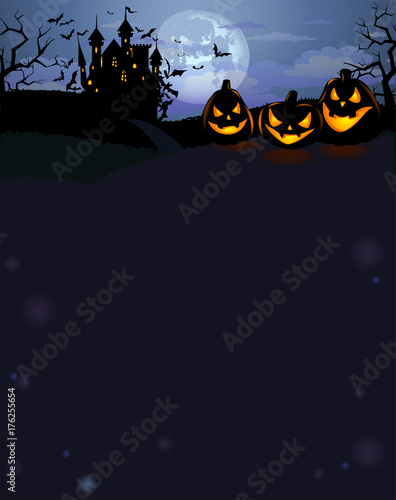 Halloween night background with pumpkin, naked trees, bat and full moon on dark background.