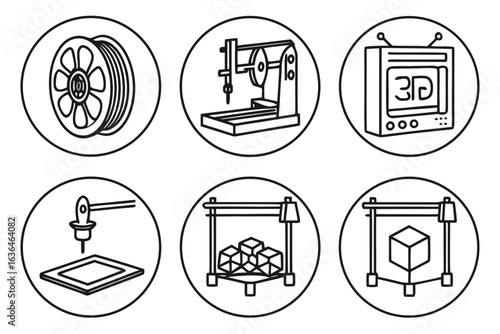 Illustration of 3d printing icons, showcasing various aspects of additive manufacturing process