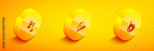 Set Isometric line Kayak, Canadian totem pole, Stack of pancakes and Wooden axe icon. Vector