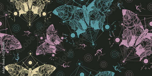 Butterfly double exposure. Seamless pattern. Packing old paper, scrapbooking style. Vintage background. Medieval manuscript, engraving art. Symbol of freedom, travel