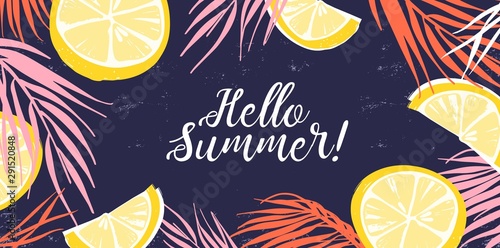 Lemon background. Colorful summer seamless pattern with hand drawn lemons and leaves. Lemon slices simple flat style vector illustration