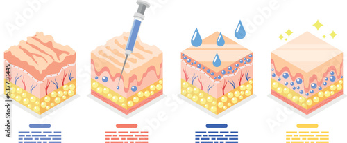 healthy human skin with collagen and elastin fibers, fibroblasts and Hyaluronic acid.
