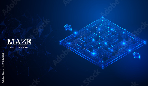 Abstract square low poly maze structure. Labyrinth mesh futuristic design with entrance and exit arrow symbol vector. Isometric blue background concept illustration.