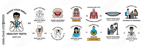 Vector graphic set. Simple isolated Icons in flat, contour, outline, thin and linear design.Dental care and dentist.Dental disease and treatment. Prosthetics, removal. Element, emblem, symbol, logo.