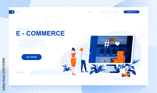 E-commerce vector landing page template with header. Online selling web banner, homepage design with flat illustrations