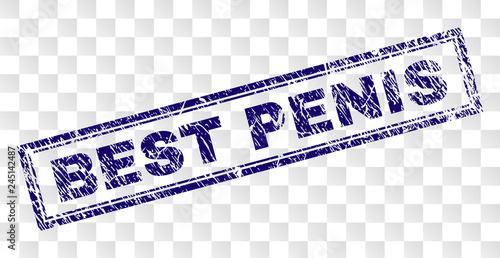 BEST PENIS stamp seal print with scratched style and double framed rectangle shape. Stamp is placed on a transparent background. Blue vector rubber print of BEST PENIS text with grunge texture.