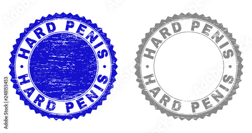 Grunge HARD PENIS stamp seals isolated on a white background. Rosette seals with grunge texture in blue and gray colors. Vector rubber stamp imprint of HARD PENIS text inside round rosette.