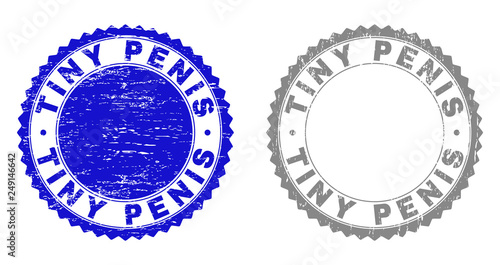 Grunge TINY PENIS stamp seals isolated on a white background. Rosette seals with grunge texture in blue and gray colors. Vector rubber stamp imitation of TINY PENIS caption inside round rosette.